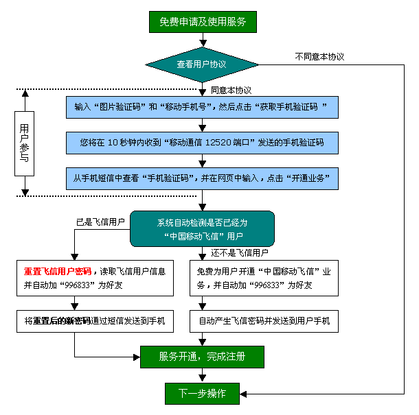 5、從未開通過“中國移動飛信”業(yè)務(wù)的用戶,申請服務(wù)須完全同意免費開通“中國移動飛信業(yè)務(wù)”,并自動加“996833”為好友,開通后及時將“飛信初始密碼”告知用戶。請用戶記錄及保管好“中國移動飛信”初始登錄密碼,由于密碼丟失或密碼泄露給第三方造成給用戶造成的各類損失,本站概不負責(zé)。